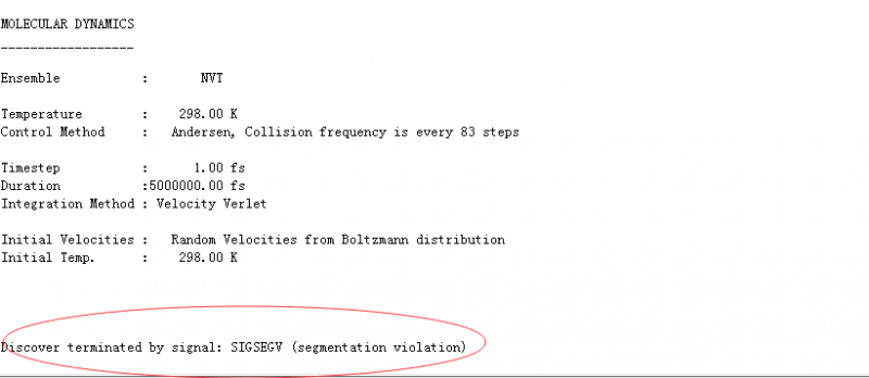 在MS中用discover跑动力学过程中,设置总步数为5000000,但总是跑到5000步不到就提示错误说什么(段违例)信号终止,其他体系计算都正常。大家有遇到过这种情况的吗?望赐教,,, 7W[LV$]3X0}$3NBNIPSUZ0Z.png YU75XRYT8H(U[1W1{`U@6(9.png |