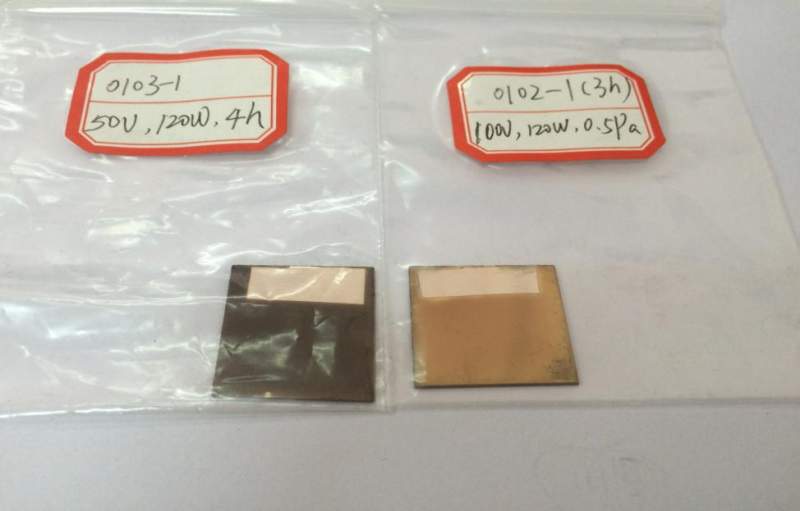 如下图,薄膜偏黑色的溅射条件是4h,0.5Pa,120w,偏压是-50V,本底真空是3.4*10-4Pa,而右边这个颜色是正常的(金黄色的),请教下,颜色不对到底是什么原因导致的,为什么会发黑呢?颜色不对会对薄膜的机械性能,与钛合金结合性能有什么影响呢?