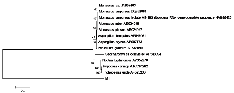 分离出的菌应该是红曲霉,但是建立系统发育树的时候为什么出现这种情况,求指导。。。M1是需鉴定的菌