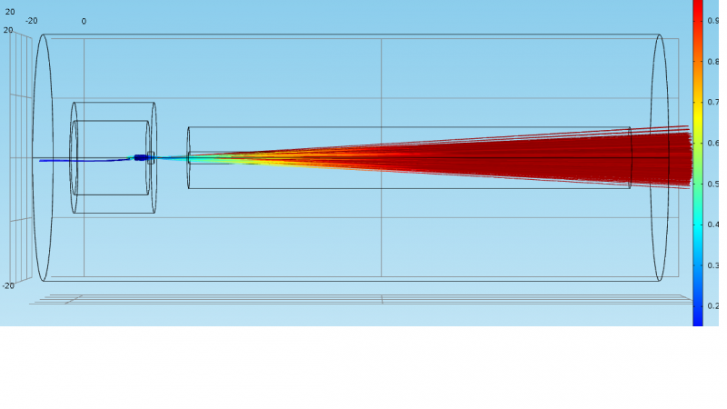 在comsol中带电粒子在电场中运行,本来带电粒子应该在小孔中运行,为什么现在他穿过边界在小孔外运行呢? 非常着急,请朋友们帮助解决下,不胜感激。