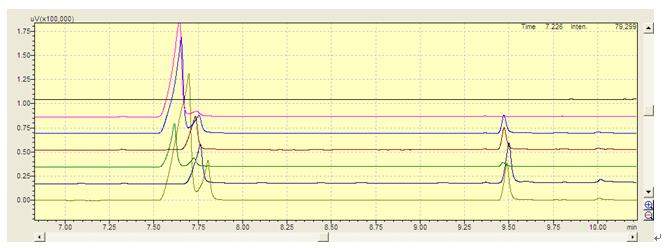 目前的问题:癸酸标样基本在7.6min出峰,但是发酵液PH处理后的有两个峰,一个在癸酸标样很近的7.7min左右,后一个峰在9.5min左右,而未有PH处理只有7.7min左右一个峰。原来认为7.7min左右的就是癸酸,但是和标样混合后,不在一个峰,是不是代表不是一种物质。