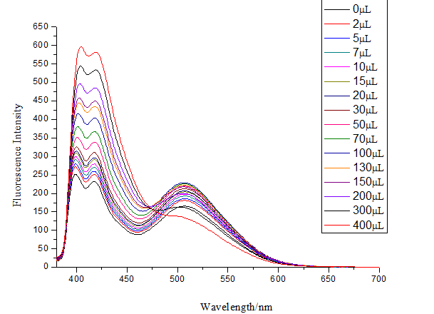 各位大侠,这是本人用一种芘衍生物荧光探针(含有C=N)检测水和乙醇的荧光光谱图,图右上角是加入水或乙醇的体积,起始测量液的体积为1mL。C探针=5*10-6,em:360。
