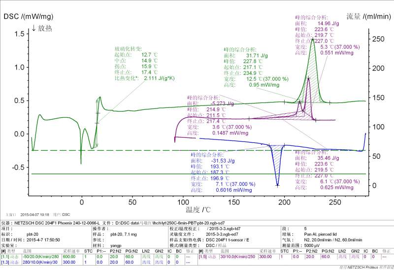 出现两个峰应该是多重熔融峰,PBT结晶很快,在一定温度下,PBT会在原有的晶体基础上进一步完善结晶,因此在升温熔融时会出现多重峰值