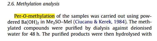 黄色部分 Per-O-methylation 是什么意思?methylation是甲基化,但是Per-O-methylation 就不知道该怎么理解了。还想顺便问一下,这篇文章是研究多糖的,他为什么要把多糖甲基化?意义何在?想达到什么目的?