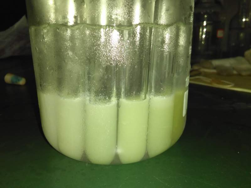 变成乳白色一定是失败了。没煮沸前是黄色的,和糖反应后是绿色,都是澄清透明的。