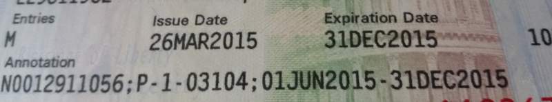 你的签证日期指的是你可以在此期间(2015年3月26日~2015年12月31日)多次进入美国,但是根据2019表,你第一次入境美国必须在开始时间(6月1日)前后一个月内。