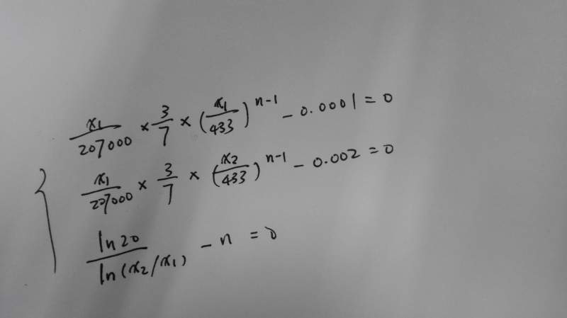 欲求得x1=403 x2=446 n=30左右的解,对未知数限定范围即可: Parameters x1[100,],x2[100,],n[30,]; //Variable ; Function x1/207000*3/7*(x1/433)^(n-1)-0.0001=0; x2/207000*3/7*(x2/433)^(n-1)-0.002=0; Ln(20)/Ln(x2/x1)-n=0; 算法设置默认即可 计算结果: 优化算法: 麦夸特法(Levenberg-Marquardt) + 通用全局优化法 函数表达式 1: x1/207000*3/7*(x1/433)^(n-1)-0.0001-(0) 2: x2/207000*3/7*(x2/433)^(n-1)-0.002-(0) 3: ln(20)/ln(x2/x1)-n-(0) 目标函数值: 2.65190088855408E-12 x1: 402.479314242841 x2: 444.735331831014 n: 30.0066408207363 |