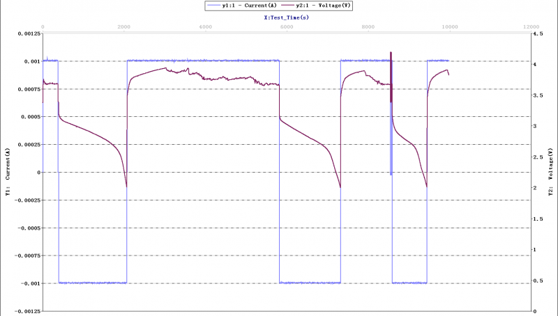 最近组装的一批电池,其中一个有平台,其他的显示全部都是充上去之后掉下来然后保持一直充电的样子。如下图。(第一次有平台的那个后来发现未压紧,可能造成极化较大,也可能是其他原因)。材料正负极为商品化的磷酸铁锂和石墨,电解质是自己做的聚合物电解质膜,电解液LiPF6/ EC/PC. 聚合物膜在做的时候有可能引入其他离子,但经过处理。请问电池是出了什么问题呢?还望各位不吝赐教。