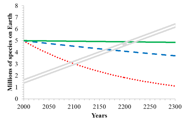 物种灭绝的速度如果能够达到每10年5%,那么地球上半数的物种都会在150年间灭绝。但是,物种更可能的灭绝速率为每10年小于1%,那么无论物种总数是200万还是800万,物种命名和描述速度都远远超过其灭绝速率。当然,相对于较稳定的物种发现率,实际的物种灭绝速率可能并非线性。