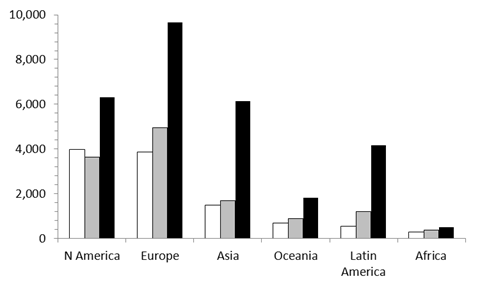 科斯特洛指出,越来越多的数据表明,“来自世界各个地区的分类学文章数量在不断增加”(图2),分类学家的数量也在不断增加。然而,可能由于新物种发现的难度越来越大,所以每个分类学家发表的新种平均数有所下降。人们对分类学家数量减少的误解,可能是由于分类学家往往要到他们临近退休是才得以扬名,因此给人一种传统分类学正在衰退的错觉。在那些曾经引领分类学的翘楚之国的翘楚研究机构,分类学家可能是在减少,但是在除了欧洲和北美之外的其他国家和地区,尤其是南美和亚洲,情况却截然不同。