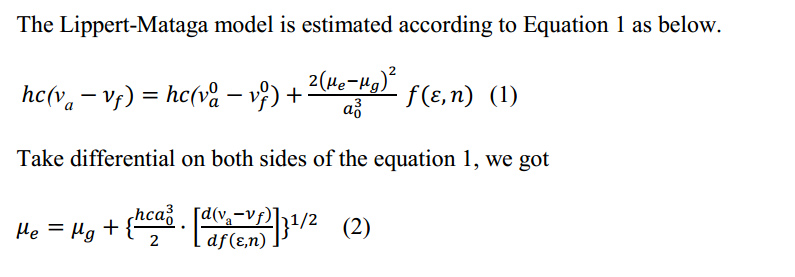 关于Lippert-Mataga 公式计算的问题 小弟用如图微分形式的公式计算μe ,但是由于得到数据μg单位为德拜,a0 单位为 nm , h 单位为J*s , c 单位为m/s ,微分部分按个人理解应该带单位cm-1,如何将单位统一变换成德拜?求大神解救!! 1FO)T]6F6015V4SJ363~KP4.png |