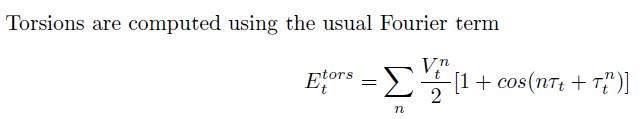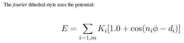 势函数的二面角扭转项:一个是势函数文献中给的形式,一个是lammps手册中给的形式,一式中的最右边那个代表相移,与之对应的二式中的di。相移是什么?这个参数如何得到? 360截图20150412210431806.jpg 360截图20150412210627534.jpg |