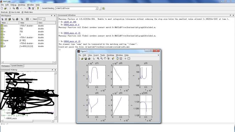 程序 ODE45_main: clc;clear tspan=[0,180]; y0=[1e-5;0;0;0;0]; [t,y]=ode45('ODE45_fun',tspan,y0); [m,n]=size(y); for i=1:m y(i,6)=-178075801.6*y(i,4)*y(i,5)+490910.1296*y(i,3)*y (i,2)+1128974.05+7481.104004*sin(2.047*t(i)); %sin(2.047*t); % y(i,4)=-3*y(i,2)*y(i,3)-4*y(i,1)*y(i,3)+8*y(i,1)*y(i,3); end data=[t,y]; save ODE45_data.txt data -ascii subplot(2,3,1),plot(t,y(:,1)),title('y(1)') Xlabel('t');Ylabel('y'); subplot(2,3,2),plot(t,y(:,2)),title('y(2)') Xlabel('t');Ylabel('y'); subplot(2,3,3),plot(t,y(:,3)),title('y(3)') Xlabel('t');Ylabel('y'); subplot(2,3,4),plot(t,y(:,4)),title('y(4)') Xlabel('t');Ylabel('y'); subplot(2,3,5),plot(t,y(:,5)),title('y(5)') Xlabel('t');Ylabel('y'); subplot(2,3,6),plot(t,y(:,6)),title('y(6)') Xlabel('t');Ylabel('y'); % plot(t,y(:,1),'bo',t,y(:,2),'rx',t,y(:,3),'gv',t,y(:,4),'r-'); grid on ODE45_fun: function dy=ODE45_fun(t,y) dy(1)=-1.918298553*y(3)*y(4)-121.6697369*y(5)*y(2)+0.006472085*y(2)*y (2)+15.25250926*y(5)*y(5)-0.518363603*sin(2.047*t)+0.001124759; dy(2)=0.007229182*y(5)*y(1)-0.013867729*y(3)-0.005151943*sin (2.047*t)+33.43424564*y(4)*y(5)-0.092169794*y(3)*y(2)-0.698266828; dy(3)=72.10986245*y(2)+0.52129529*y(4)*y(1)+0.025471074*y(3)+921.886526*y(4)/y(1)- 0.47870471*y(4)+0.025471074*y(1)*t-0.38220722*cos(2.047*t)-4.62279911; dy(4)=-57.37263009*y(5)+0.001053501*y(3)*y(1)+20.28825016/y(1)-0.001053501*y (3)+0.064741605*y(4)+20.28825016*t-0.006201915*sin(2.047*t)-3651.904822; dy(5)=0.017284293*y(4)+0.00278644*y(1)*y(2)-0.551218454*y(2)*y(5)*y (5)+0.010839281*y(2)*y(2)*y(5)+0.020353114*cos(2.047*t)+0.110594984; dy=[dy(1);dy(2);dy(3);dy(4);dy(5)]; |