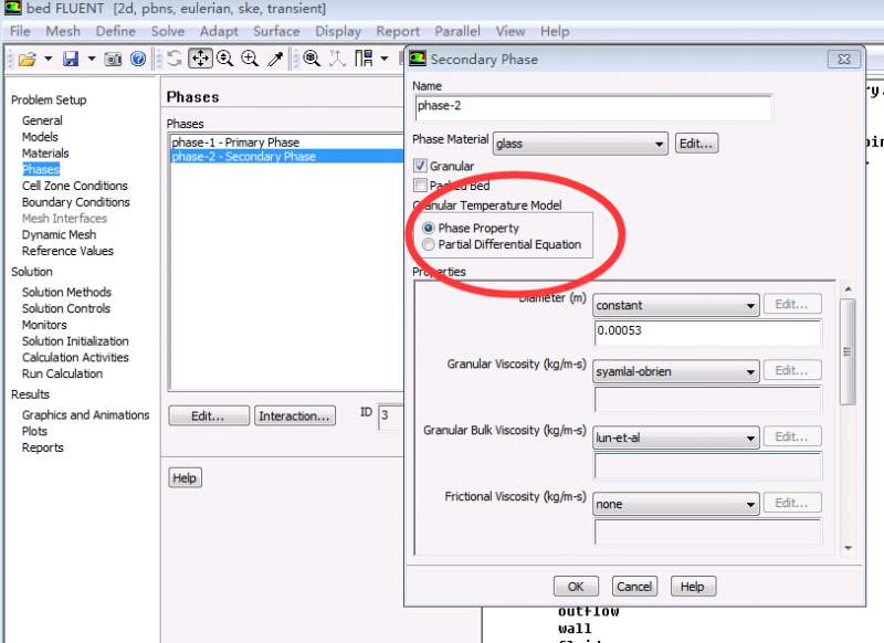 流化床模拟,fluent的颗粒相设置 Granular temperature model模型怎么选择?在Granular temperature model设置面板下,有两个选项,分别是phase property和partial differential equations,应该怎么选择?又有什么区别呀?
