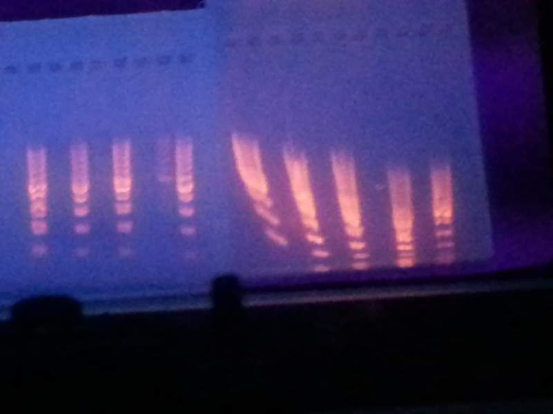 配了两块胶,一块为1.5%的,一块为2%的,有两个问题,1是为什么我的marker跑了70min还没有完全跑开,电压为90V;2是1.5的那块胶为什么会斜成这样?我记得配置的时候 里边忘记叫TAE了,是这个原因引起的么?