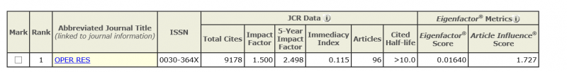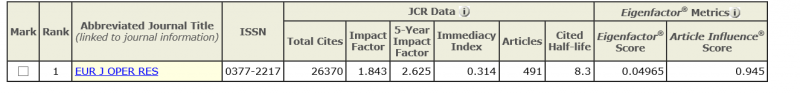 我在JCR上查看了一下这两类期刊,见图所示。如果只是看impact factor,似乎可以直接对比期刊的质量好坏。可现在我看到了Article Influence Score这项指标,看了有些犹豫了。因为我知道业内说OR比EJOR要好很多,但为什么EJOR的影响因子比OR要高?我最终要依据什么去判断期刊的排名呢?谢谢,请前辈高手指导一下! |