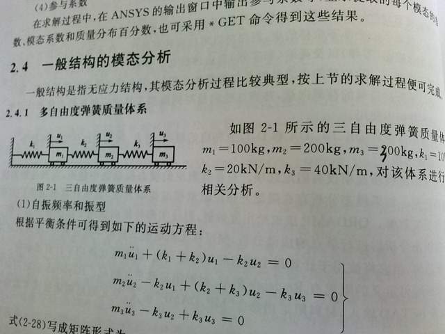 下面是用到的一个简单例子,手算的模态质量M1=1264.1979,但是ansys计算结果是506.8078,手算的第一阶向量是(1.0000,1.4420,1.5794)的转置