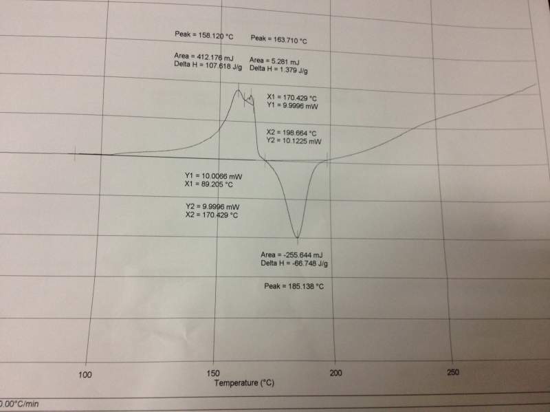 这是我合成的一种化合物的DSC曲线图,请问下为什么会有吸热峰又有放热峰呢,是不纯还是反应了,各峰代表什么意思?谢谢~~~~~~~~~