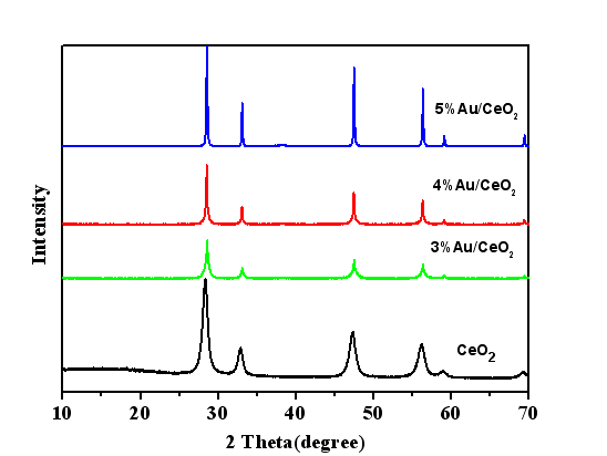 从XRD上Au的衍射不太明显,由于你的CeO2晶型太好将Au的衍射峰给压低了,但是也能看到一些特征(39.6度)。表明你的Au分散度比较好,而且粒径也比较小。 而且从空白和不同Au负载量的XRD可以看出,随着金负载量的增加CeO2的结晶度增强,这个也有很多文献报道! |