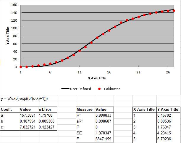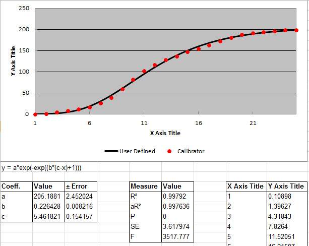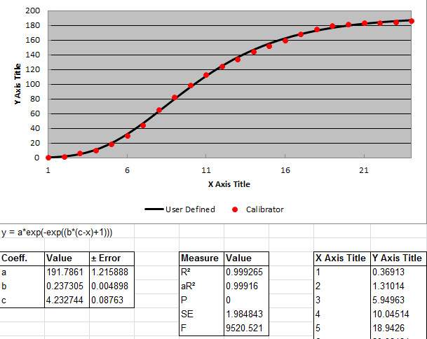 采用y = a*exp(-exp((b*(c-x)+1))) 拟合结果如下: 1.第一组数据 Coeff. Value ± Error Measure Value a 157.3891366 1.797679914 R2 0.998832996 b 0.187994015 0.005308194 aR2 0.99868712 c 7.032721098 0.123426618 P 0 SE 1.97834687 F 6847.158509 2.第二组数据 Coeff. Value ± Error Measure Value a 191.7860672 1.215887605 R2 0.999265286 b 0.237305133 0.00489767 aR2 0.999160327 c 4.232744315 0.087629942 P 0 SE 1.984842874 F 9520.520501 3.第三组数据 Coeff. Value ± Error Measure Value a 205.1880918 2.45202373 R2 0.997919687 b 0.226427954 0.008216131 aR2 0.997636008 c 5.461821485 0.154157226 P 0 SE 3.617973983 F 3517.776983 |