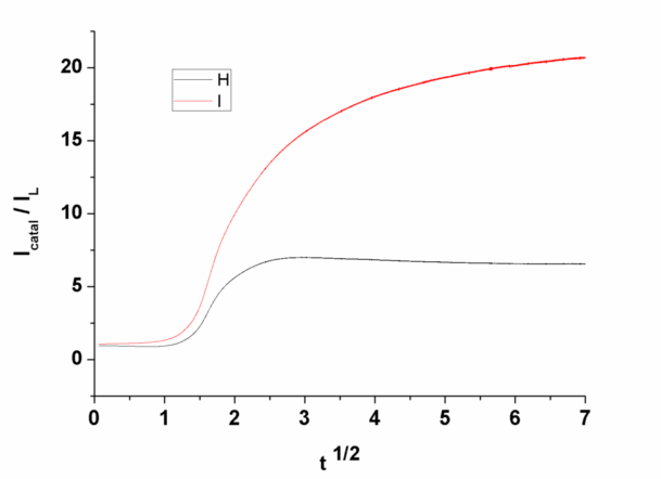 在碱性甲醇氧化中,会遇到这种图 插图中有个I(catal)/I(L)对√t 作图得出斜率,然后计算出K。计算方法如下: 想问问各位大神√t 的取值从多大取,取多大范围,是取哪段线性区? 我的图如下,两个跟线分别是0.4 M CH3OH, 0.1 M CH3OH in 1 M KOH. 请各位大神指点,不胜感激!!! |
