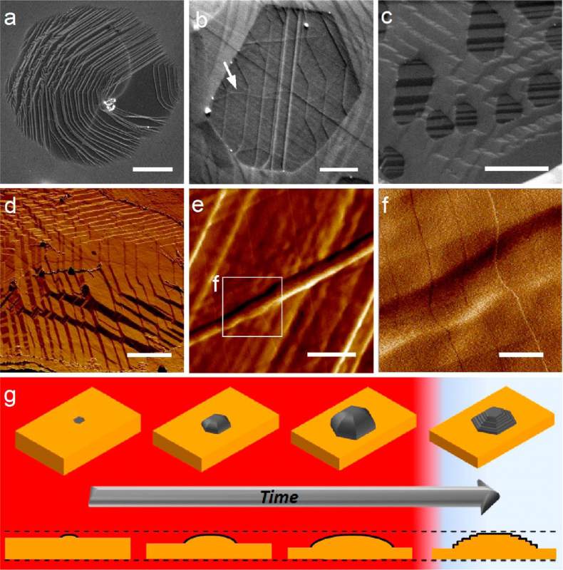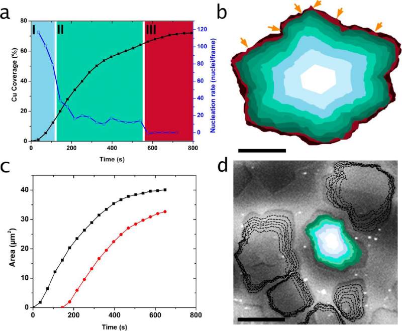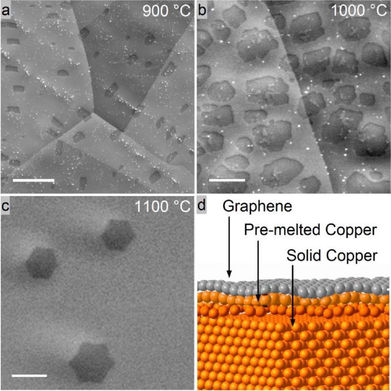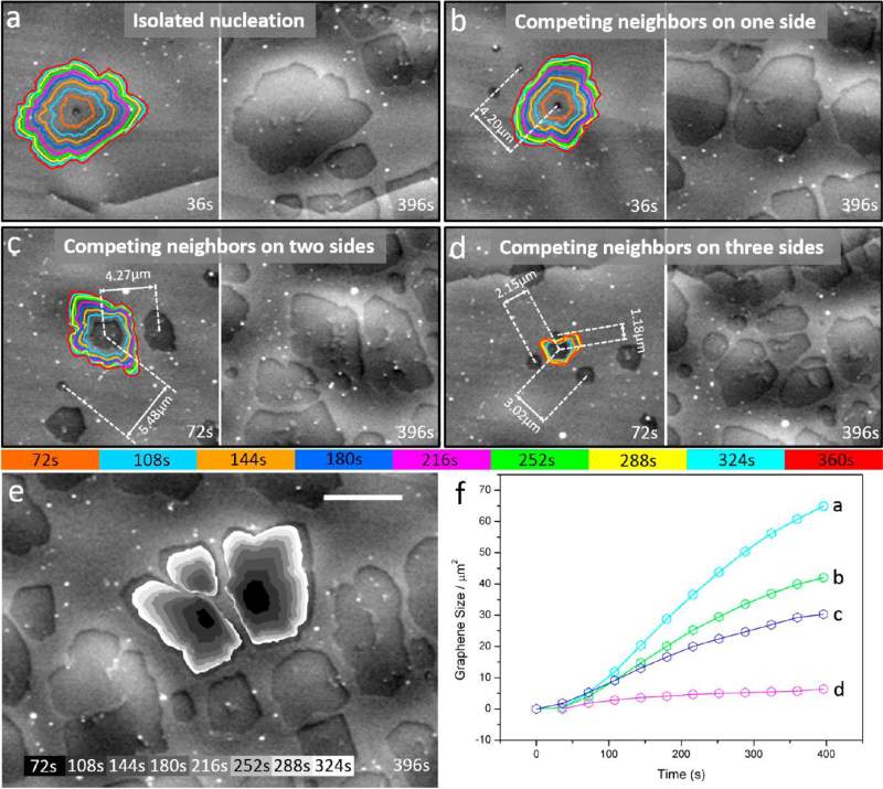 This work highlights the importance of in situ experiments for an improved understanding of graphene growth on copper via metal-catalyzed chemical vapor deposition (CVD). Graphene growth inside the chamber of a modified environmental scanning electron microscope under relevant lowpressure CVD conditions allows visualizing structural dynamics of the active catalyst simultaneously with graphene nucleation and growth in an unparalleled way. It enables the observation of a complete CVD process from substrate annealing through graphene nucleation and growth and, finally, substrate cooling in real time and nanometer-scale resolution without the need of sample transfer. A strong dependence of surface dynamics such as sublimation and surface premelting on grain orientation is demonstrated, and the influence of substrate dynamics on graphene nucleation and growth is presented. Insights on the growth mechanism are provided by a simultaneous observation of the growth front propagation and nucleation rate. Furthermore, the role of trace amounts of oxygen during growth is discussed and related to grapheneinduced surface reconstructions during cooling. Above all, this work demonstrates the potential of the method for in situ studies of surface dynamics on active metal catalysts.基于改装SEM的实时观测石墨烯CVD生长