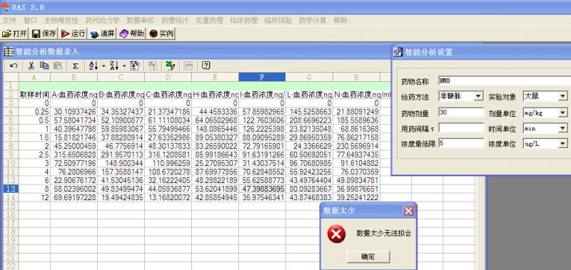 我在用DAS2.0的“智能化分析”模块进行药动学参数计算是,在输入数据,设置好各项参数之后,系统总是提示我数据太少无法拟合,麻烦各位老师帮忙分析一下原因,并指导一下,告诉我该怎么办,谢谢,非常感谢