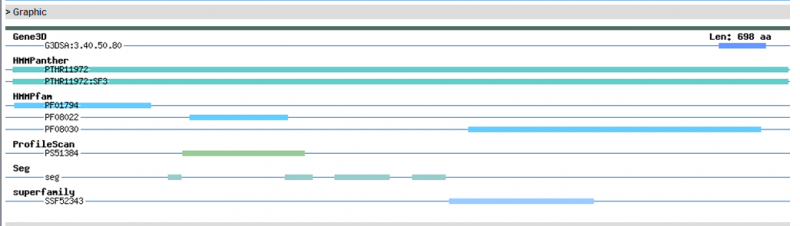 第一张图是一级序列加二级结构的图,上面是二级结构把a-螺旋,β-折叠片和无规则卷曲和与之对应的AA序列都标出来了 第二张图是分别用了gene3D、HMMPanther、HMMPfam、profilescan和superfamily对你的这个蛋白保守结构域和亚家族的归类与预测。 第一行用gene3D数据库预测你的这个蛋白的基因序列含有属于Nucleotide-binding domain of ferredoxin-NADP reductase (FNR) module家族的序列 第二行用Panther数据库将你的这个蛋白的序列归类为NADPH OXIDASE (PTHR11972)家族的SF3亚家族 第三行用HMMPfam软件预测到你的这个蛋白上存在编号为PF01794、PF08022、PF08030三个保守结构域 第四行用profilescan数据库在你的蛋白上存在一个在这个数据库中编号为PS51384的结构模型 第五行不知道是个啥 第六行就是个supfamily的一个归类,说明你的蛋白有一部分序列属于编号为SFF52343的一个亚家族序列 |