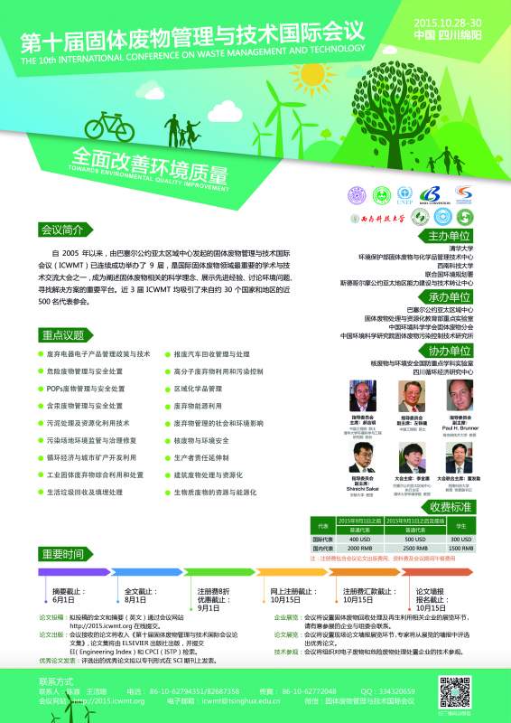 第十届固体废物管理与技术国际会议 “全面改善环境质量” 时间: 2015年10月28-30日 地点: 中国 四川绵阳 主办单位:清华大学 环境保护部固体废物与化学品管理技术中心 联合国环境规划署 西南科技大学 斯德哥尔摩公约亚太地区能力建设与技术转让中心 承办单位:巴塞尔公约亚太区域中心 固体废物处理与资源化教育部重点实验室 中国环境科学学会固体废物分会 中国环境科学研究院固体废物污染控制技术研究所 协办单位:核废物与环境安全国防重点学科实验室 四川循环经济研究中心 会议简介: 自2005年以来,由巴塞尔公约亚太区域中心发起的固体废物管理与技术国际会议(ICWMT)已连续成功举办了九届,它已成为国际固体废物领域最重要的学术与技术交流大会之一,是阐述固体废物相关的科学理念、展示先进经验、讨论环境问题、寻找解决方案的重要平台。ICWMT9更是吸引了来自32个国家和地区的500多名代表参会。 第十届会议拟于2015年10月28-30日在四川绵阳举行。本届会议将本着“全面改善环境质量”的理念,邀请国内外知名专家和政府高级官员就固体废物、化学品和循环经济领域的热点问题做特邀报告和专题讨论,并组织对电子废物和危险废物处理处置企业的技术参观。 重点议题: 废弃电器电子产品管理政策与技术 危险废物管理与安全处置 POPs废物管理与安全处置 含汞废物管理与安全处置 污泥处理及资源化利用技术 污染场地环境监管与治理修复 循环经济与城市矿产开发利用 工业固体废弃物综合利用和处置 生活垃圾处理和回收利用 生物质废物的资源化与能源化 报废汽车回收管理与处理 高分子废弃物利用和污染控制 区域化学品管理 废弃物能源利用 废弃物管理的社会和环境影响 核废物与环境安全 建筑废物处理与资源化 生产者责任延伸制 填埋场渗滤液安全处置 建筑废物处理与资源化 重要时间: 论文征集及评选: 会议征集与会议议题相关的研究领域的论文,论文摘要(英文)和全文均通过会议网站http://2015.icwmt.org在线提交。 论文出版:会议接收的论文将收入《第十届固体废物管理与技术国际会议论文集》,论文集将由ELSEVIER出版社出版,并提交EI(Engineering Index)和CPCI(ISTP)检索。 优秀论文发表:评选出的优秀论文拟以专刊形式在SCI期刊上发表。 企业展览:会议将设置固体废物回收处理及再生利用相关企业的推介展览环节,请有意参展的企业与组委会联系。 论文展览:会议将设置现场论文墙报展览环节,专家将从展览的墙报中评选出优秀论文。 技术参观:会议将组织对电子废物和危险废物处理处置企业的技术参观。 会议语言:会议工作语言为英文,主会场配有中英文同声传译。 收费标准: 代表 2015年9月1日之前 2015年9月1日之后及现场 学生 普通代表 普通代表 国际代表 400 USD 500 USD 300 USD 国内代表 2000 RMB 2500 RMB 1500 RMB 注:注册费包含会议论文出版费用、资料费及会议期间午餐费用。 汇款信息: 账户名称 清华大学 帐号 0200004509089131550 开户行 中国工商银行北京分行海淀西区支行 附言 至环境学院ICWMT10注册费 联系方式: 电话: 86-10-62794351/82686410 传真: 86-10-62772048 电子邮箱:icwmt@tsinghua.edu.cn 会议网站:http://2015.icwmt.org 海报修改中文-最终-01副本.jpg |