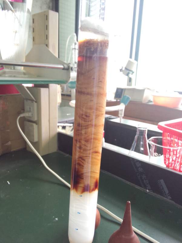1.各位评价一下我的柱子,这样洗脱下去影响会很大吗?这是用氯仿甲醇(9:1)等度洗脱至底部时的柱子,我装柱时时底部一边真空抽气一边加入硅胶的,上样时直接借助漏斗慢慢加入,没有注意赶走气泡,结果柱子上段有断层现象。