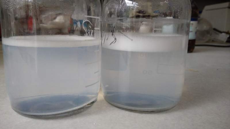 我用的酸溶液合成的介孔生物玻璃,家里硅钙磷搅拌一天以后有时候是出现上面的情况,溶液浑浊但不分层