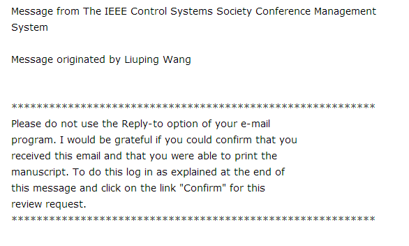 给位路过的大神下午好: 3月24日,小弟向今年12月份在日本举行的IEEE CDC会议发了一篇paper。 今天,收到了两封来自澳大利亚皇家理工大学 一位教授的 Email 邀请我修改文章两篇和我的文章接近的文章 丝毫没有提到我的文章 让我有点摸不着门道 不知道是什么意思 求大神指点 |