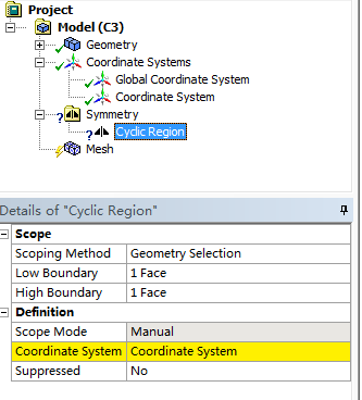 用workbench做静态结构分析,图2红色面为high boundary,其对面为low boundary,建立了笛卡尔局部坐标系,但在对称边界条件设置时不成功,坐标系系统为高亮黄色,