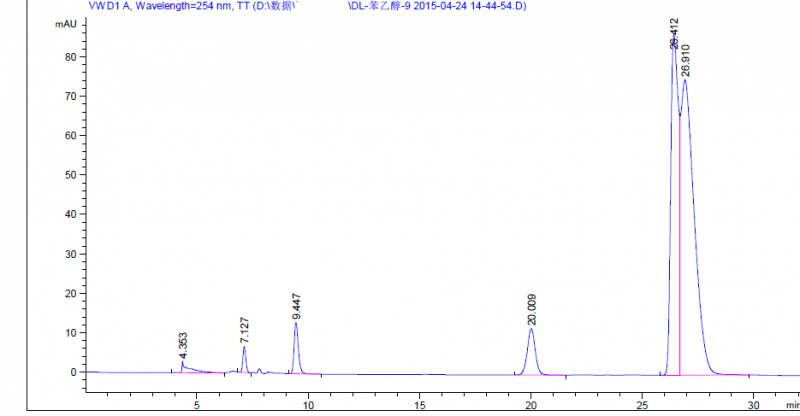 求助大神如何用液相将DL-苯乙醇的两个峰分开,大概就是下图的26min的两个峰,方法是流动相为99%的正己烷加上1%的异丙醇,流速是0.5mi/min,柱子是IE柱,也使用过AD-H的柱子,但是几乎没有分开。只要是能分开这种物质的任何方法均ok,谢谢各位啦 DL-苯乙醇液相图谱.png |