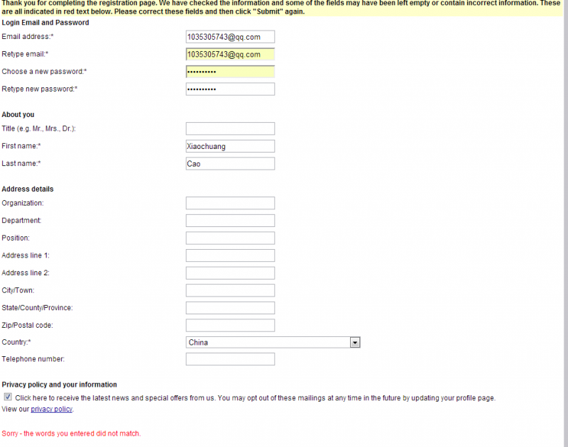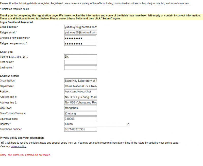 最近有人投稿Ecology,打算注册下,但是填写相关信息后,一直注册不上,提示“Thank you for completing the registration page. We have checked the information and some of the fields may have been left empty or contain incorrect information. These are all indicated in red text below. Please correct these fields and then click "Submit" again”