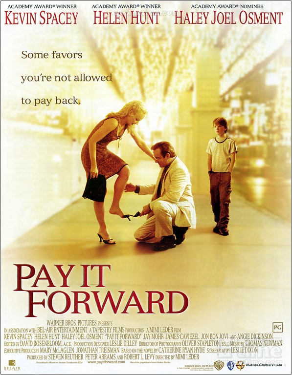 Recently I watched a movie named "pay it forward' , it touched sth deep in my heart and make me believe there are sth beautiful things in this world,which is not exactly shit. This is my favorite picture ![]() ![]() So what is exactly meanning for "pay it forward‘'? Let me quote a word said by Trevor in movie, ’'When someone does you a big favor, don't pay it back... Pay It Forward‘’ If you don't understand just follow my pic. ![]() ![]() ![]() ![]() ![]() ![]() Is it possible for one idea to change the world? Maybe that's a dream but I love it! Sometimes The Simplest Idea Can Make The Biggest Difference. I strongly recommended this movie to you ,I bet you won't regret. By the way ,I love Haley Joel Osment,he has so much wonderful moments in many movies when he was little. ![]() Plus could you share how do you feel about it? Here is my 360yunpan share link If you want to watch this movie. Call me LeiFeng,please http://yunpan.cn/cjfxj8k8YA7xX code: e911 pay it forward.jpg [ Last edited by zhang9651 on 2015-4-28 at 19:49 ] |