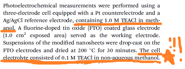 是利用TEACl (四乙基氯化铵)溶解在甲醇里制备电解液 但是我不明白是什么意思 或者说是不敢确定 我的理解是下面两种: A:溶剂甲醇的量不一定 但是测试用的电解液里包含0.1moL 的TEACl (感觉这个不太靠谱) B:就是0.1mol/L的TEACl的甲醇溶液(好像也并不是) 麻烦各位帮我看一下 究竟是哪一种理解比较正确 或者是有经验的同学看一下是否应该是另外的理解? ~~.png |