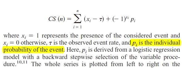 我是一个医生,最近在做学习曲线的研究,刚刚弄懂CUSUM的计算。读文献发现应该要做成风险调整的(risk-adjusted)CUSUM,我的是计数型资料,请各位高手赐教。下图的Pi值是怎么计算得来的,每个人的p值是不一样的吗?