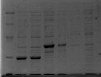 下图从左到右分别是Marker,目的蛋白1 诱导,目的蛋白1 未诱导,目的蛋白2 诱导,目的蛋白2未诱导,空载体未诱导,空载体诱导。(都是未破碎的,实际上破碎后发现在沉淀,形成包涵体了,伤心。。。。。