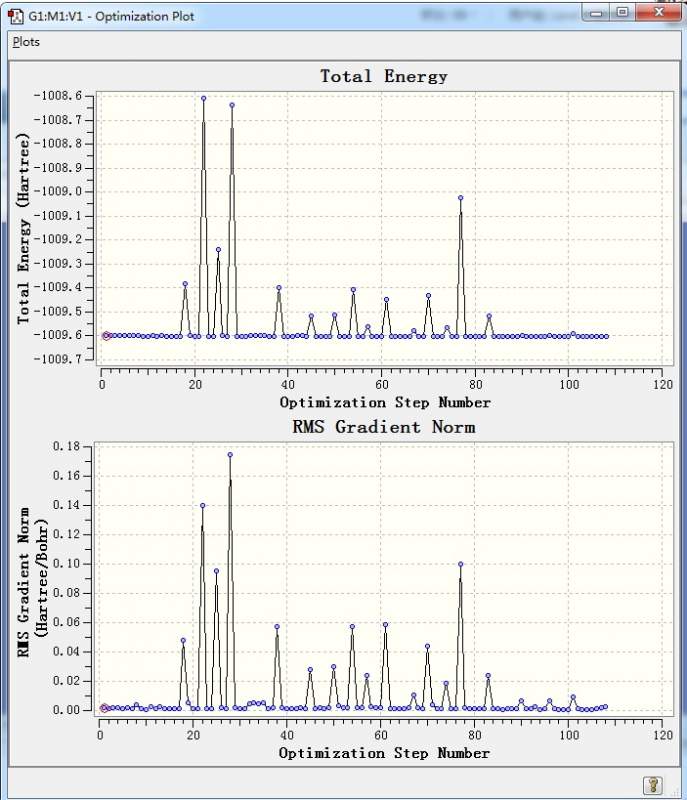 计算一个分子结构时每次都是L9999错误,其optimization曲线都类似,如下图所示 尝试了微调初始构型、降低收敛标准(scf=conver=6)、vshift=300、用冗余内坐标且标记所有O-H键,但依旧没解决。 请问这是怎么回事? 怎么才能解决? 谢谢大神指教。 每次都这样.jpg |