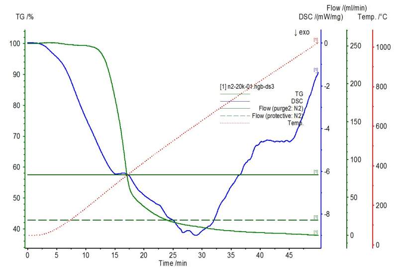 这是在氮气气氛下,升温速率20k/min,粒径0.1mm的生物质颗粒热解所得图片。所用仪器为STA 449F3同步热分析仪。TG曲线能够看明白,这个DSC曲线怎么一直朝下走,没有基线没有平滑段,怎么去算吸热量等数据呢?哪位大神解答一下……