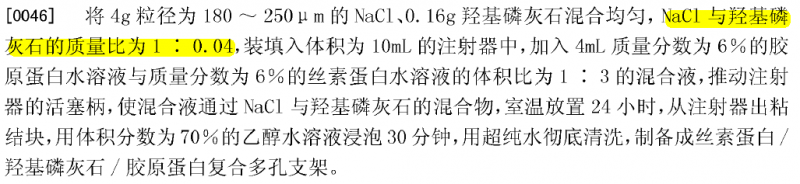 看到一个专利:丝素蛋白/羟基磷灰石/胶原蛋白复合多孔支架的制备方法,说利用氯化钠做致孔剂,以针筒为反应容器来制备复合支架,但是我不太理解,有没有人做相关方面的东西,或者手头有相关文献的虫友帮忙解释一下或给两篇相关文件让楼主参考参考 制备支架.PNG |