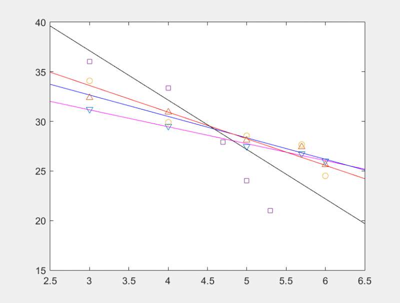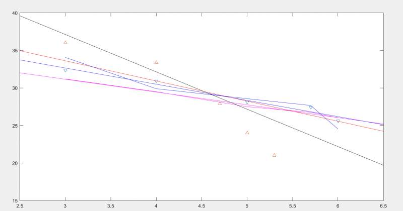 我画了四条拟合的直线,数据点要求有颜色和形状的区别,拟合后的表达式(直线)也要有不同颜色(第四条的横坐标不太一样,所以没有在循环里面),我最初写的代码见附录1,图片如图1-1所示。这个图有一个缺点是,散点图的形状是我想要的,但是颜色是随机的,我希望散点图的颜色和直线的颜色也是对应的,只要粉红、蓝色、红色、黑色四种,于是我把代码中字符矩阵color_shape由['v','^','o','s']改为了['mv','b^','ro','ks'],但是却出现了图1-2的图形,多了两条线(从变成了6条),而且只出现了头两组散点图,后面的方形和圆形的散点图不见了。