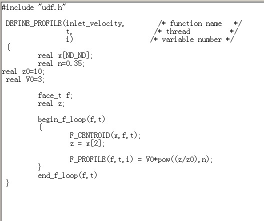 UDF大神们,能帮我看看的我入口UDF函数怎么修改啊,三维的速度入口,入口长1006m,高435m,想让入口速度随着高度呈指数变化,公式v=v0(z/z0)的n次方,其中v0=3,h0=10,n=0.35,入口截面是矩形,我自己弄的函数是这样的,大家看怎么改正下啊 UDF.png |