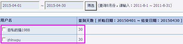 ![]() ![]() 全勤版主名单(共2人,签到30天): 自私的猫1988, zhlnwpu, ![]() ![]() 每人奖励0.02VIP! ![]() ![]() 4月签到情况 [ Last edited by book2005593 on 2015-5-5 at 16:17 ] |