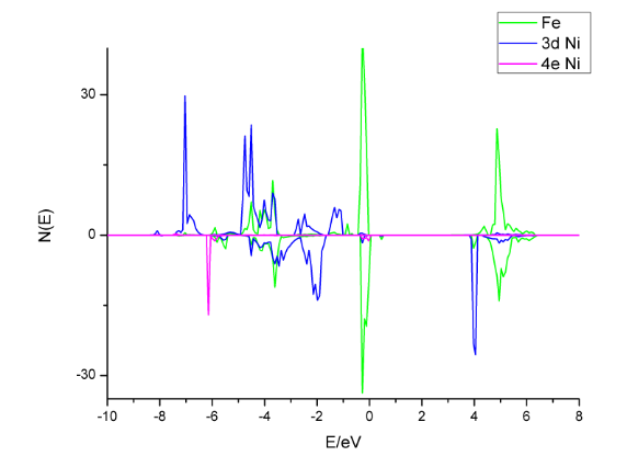 第一条是绿色的是铁的d轨道,第二条蓝色的是等价的Ni的d轨道,而第三条紫色的是另一种位置的Ni。为什么那个位置的Ni的峰这么窄而且只有向下的峰??这不合理啊? {W278IXXICHGODK6]SG48IF.png |