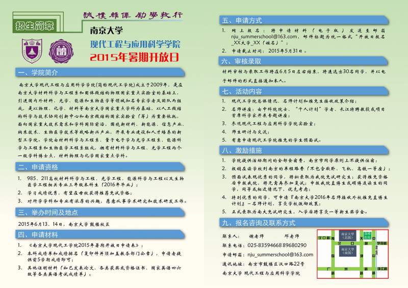 致各位亲爱的小伙伴: 为了不让炎热枯燥的夏日时光就那样无聊地从指间流失,为了让我们的暑假过得更充实,所以,我们一起相约在南大,相约于现代工程与应用科学学院2015年暑期开放日。 具体的报名细则,请参看以下招生简章。 开放日.jpg |