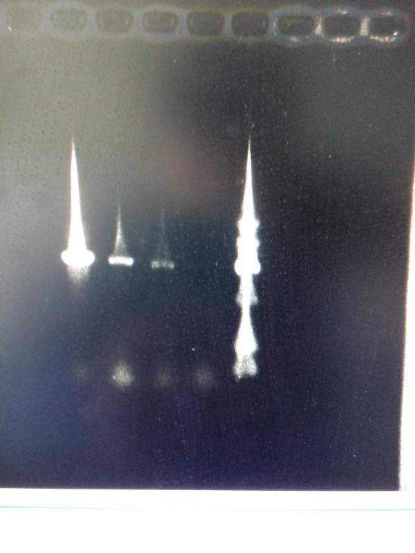 电泳后EB染色,出现这种情况,最右边是marker。为什么会有尖尖的尾巴