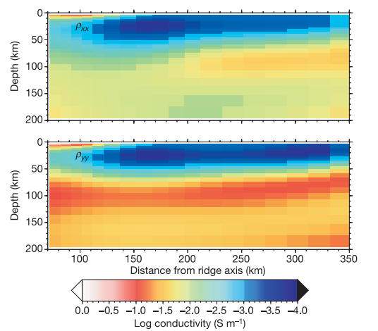 查了很多文献,发现对于400km以下通常是用地磁反演进行电导率测量的,但是这种方法似乎分辨率不高,有没有相关报道过精确度较高的能够分辨出具体电导率结构的文献,类似于下图这样的剖面图(这个是400km以上的) Snap1.jpg |