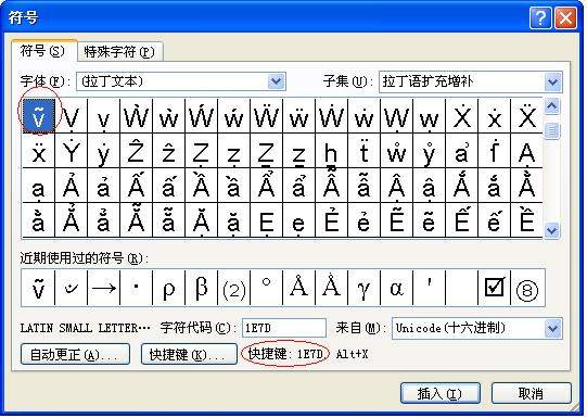 今天偶然翻看word的插入符号表,看到了 ṽ 这个波数符号,希望对大家有用。 相关链接见: http://muchong.com/bbs/viewthread.php?tid=5003406&fpage=1&target=blank http://muchong.com/bbs/viewthread.php?tid=3088438&fpage=1&target=blank |